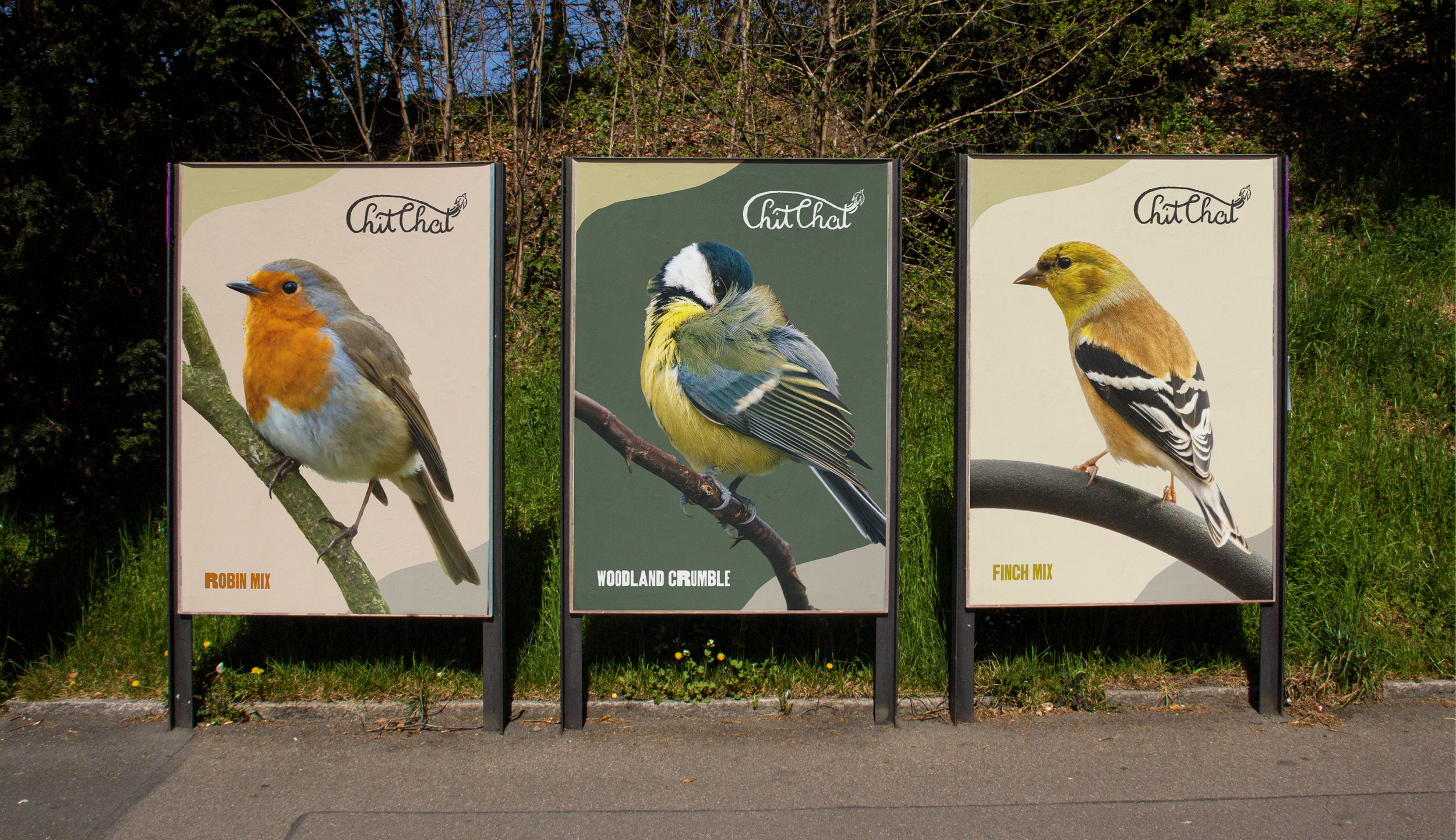 By placing these ads in outdoor environments, the campaign connects directly with its audience in spaces where bird feeding is most relevant. The natural colour palette, featuring soft greens, earthy browns, and muted yellows, ensures the posters blend seamlessly into rural and suburban settings while remaining eye-catching in urban locations. The Chit Chat logo, placed subtly at the top, reinforces brand identity without overpowering the imagery.